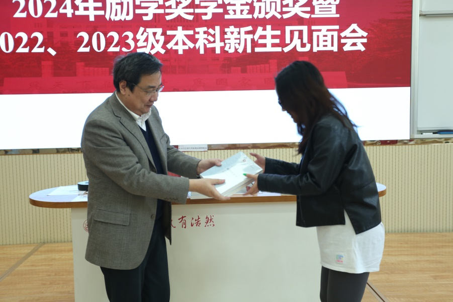 刘军、王芬分别向励学奖学金一等奖、二等奖获奖同学颁发荣誉证书。一等奖获得者2020级本科生付建丰代表获奖同学表达了对学校、学院、老师及校友们的感激之情,表示今后要继续努力,积极进取,以实际行动回馈师长厚爱,并分享了自身学习成长经历,为新生们提供了关于专业学习、田野实践的有益建议。