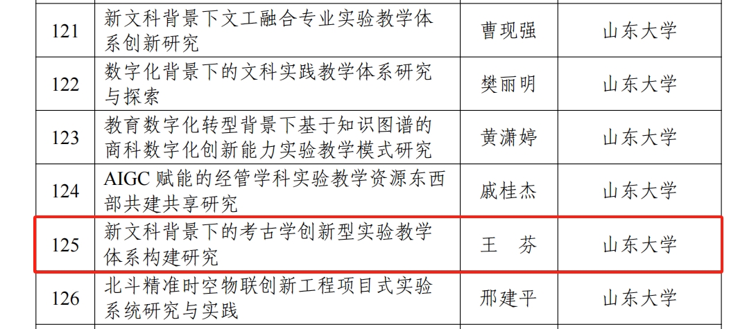 王芬教授负责的“新文科背景下的考古学创新型实验教学体系构建研究”获批立项,这也是全国高校考古学领域唯一获批的项目。此次立项不仅展现了学院在考古学实验教学领域的突出成绩,更标志着我校考古学在实验教学改革及基础学科拔尖人才培养道路上迈出了更加坚实的步伐。