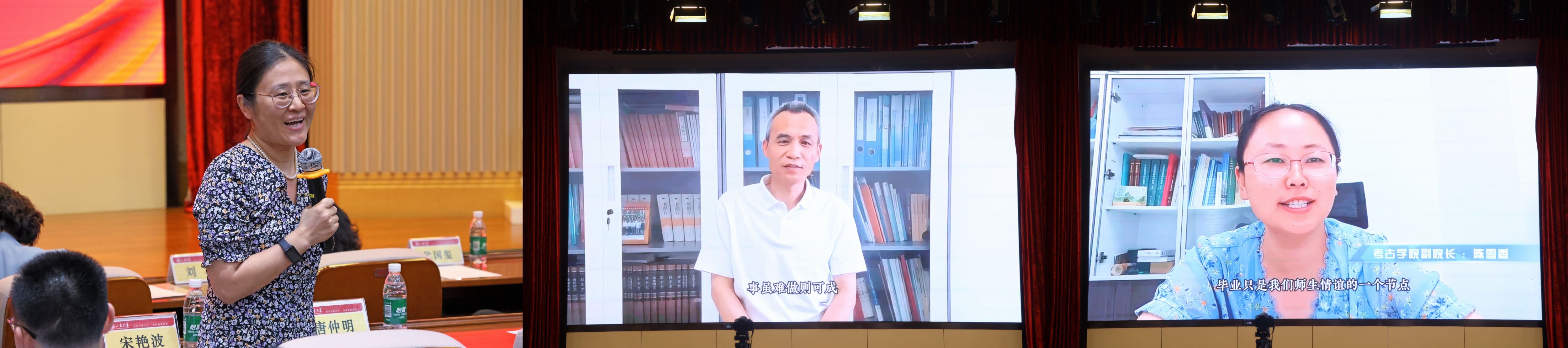 王灿教授作为教师代表为毕业生送出寄语。张新刚寄语各位毕业生,毕业后要全身心投入自己的生活,找到自己真正热爱的事物,保持对世界的好奇,在漫长人生中成为更好的自己。他以古希腊英雄奥德修斯为例,希望同学们接受生命有限性,在人生旅程中成为有故事的人,把自己活成值得传颂的故事。王灿回顾了师生共同在课堂研讨、讲座思考、实习基地实践及论文创作中结下的深厚情谊,希望各位同学无论从事哪种行业,都应敬畏事实、踏实前行,以热爱与责任感成为中华优秀传统文化及人类文化遗产的守护者、解读者与传播者。最后,他祝福全体毕业生携历史智慧与考古坚韧,在人生道路上发掘无限可能。