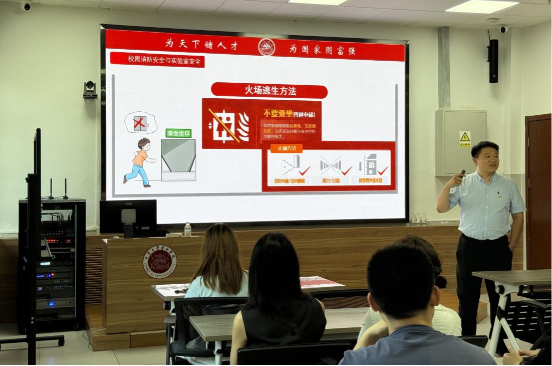 首先,党委保卫部韩知乐老师为师生系统剖析了火灾防控要点。通过校内外典型火灾案例,深入阐释火灾危害性、预防措施及应急处置流程,强调消防安全责任意识与预防紧迫性。针对生活场景,重点警示室内吸烟、电热毯使用风险,明确电热毯失火可能引发楼层火灾,并指出泼水降温等应急处置误区。在实验室安全管理保护方面,剖析实验过夜、人员擅离、有机溶剂管控及通风清洁等关键问题,结合某校实验室爆炸实例,重申灭火器材配置与规范操作的必要性。在逃生技能方面,指导师生在疏散时保持低姿、沿安全标识快速撤离复杂场所,严禁使用电梯。在消防救援策略方面,详解灭火器分类应用,明确灭火距离与有效喷射时长。此外,讲座延伸至生活安全领域,涵盖有毒物质防护、一氧化碳中毒急救及工作场所应急呼叫流程,全面强化师生风险辨识与应急处置能力。