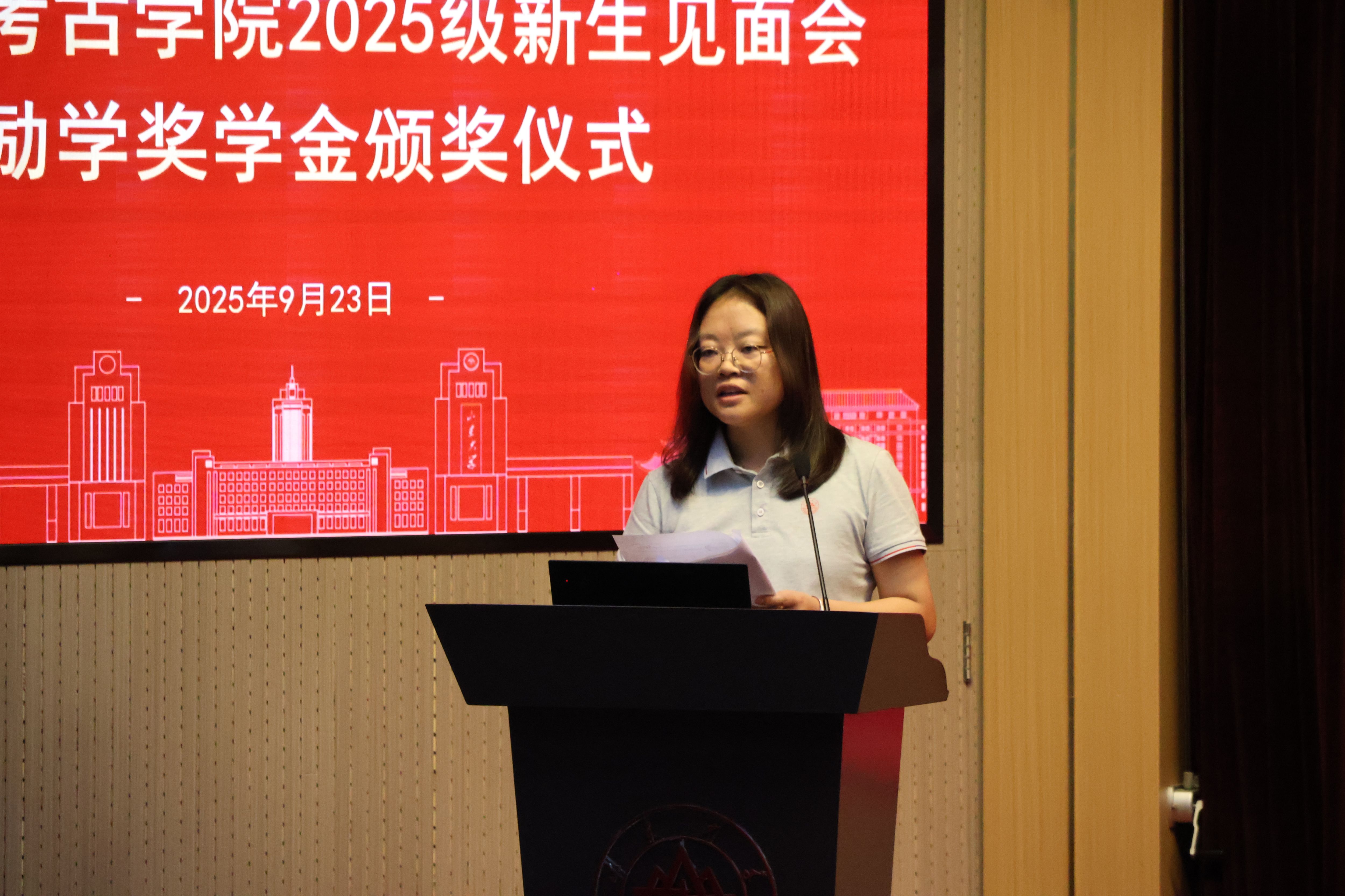 “为天下储人才,为国家图富强”的办学宗旨,阐述了新时代考古学科发展的重大机遇与当代考古人的历史使命。她向新生提出三点殷切期望:一要心怀敬畏,以严谨科学的态度守护文明根脉;二要苦练内功,在田野实践与学术研究中夯实专业基础;三要开拓创新,以跨学科视野激发研究活力。最后,她勉励全体新生在探索文明的新征程中坚守初心,让青春在探索文明的征程中贡献智慧的过程中绽放光芒。