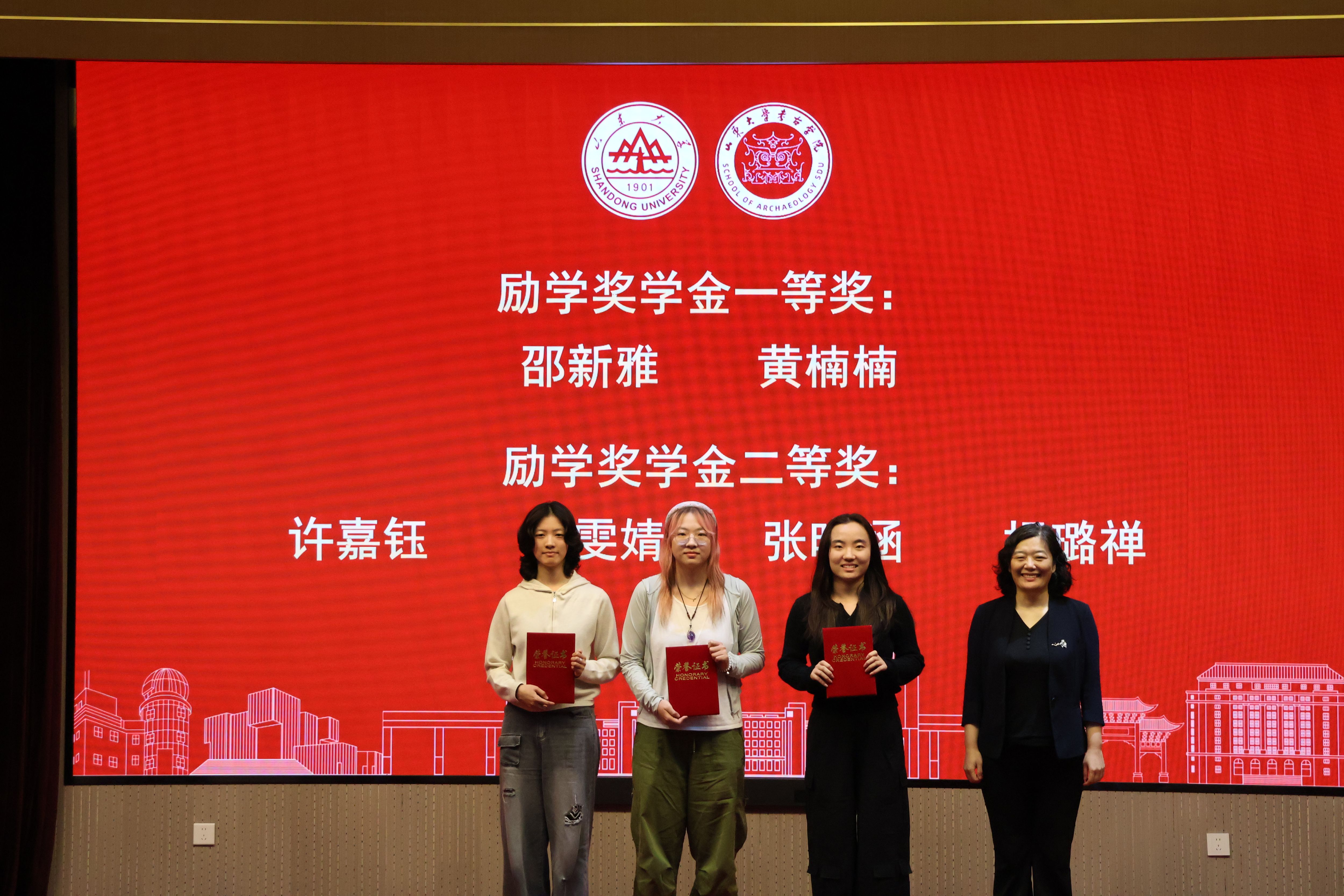 考古学科发轫初期首次刊发山大师生考古发掘报告的杂志名称。在2025年励学奖学金颁奖仪式上,王芬为获奖学生代表颁奖,并合影留念。