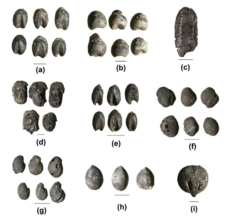 图二 郭家枣园遗址出土部分炭化植物遗存照片(a)粟(Setaria italica); (b)黍(Panicum miliaceum); (c)水稻(Oryza sativa); (d)大豆(Glycine max); (e)狗尾草(Setaria viridis); (f)胡枝子属(Lespedezasp.); (g)草木犀属(Melilotussp.); (h)铁苋菜(Acalypha australis); (i)葡萄属(Vitissp.) (比例尺: 1 mm)