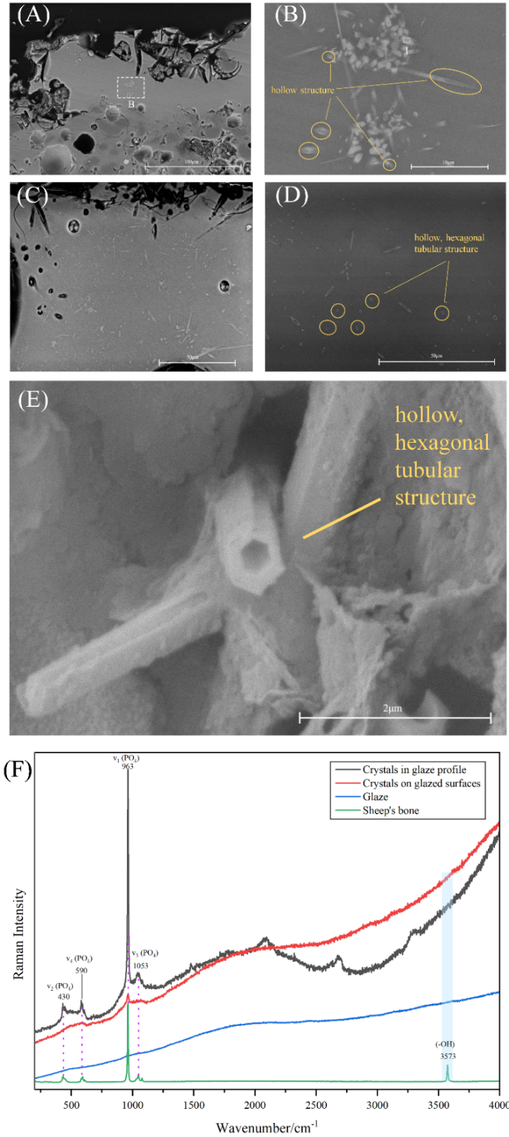 本研究选择邛窑十方堂窑址出土的十六件唐代乳浊釉青瓷碎片作为研究对象,借助于SEM-EDS、拉曼光谱等分析技术,分析了邛窑产品化学组成、显微结构和物相特征等信息。研究发现,其中一件邛窑乳浊釉青瓷碎片表面和剖面均存在大量空心六棱管状晶体,分析表明这种管状晶体是动物骨灰中羟基磷灰石晶体受热未完全分解的产物。现代瓷器生产中,骨瓷的发明及商业化生产被广泛认为是始于1800年左右的英国。本研究结果表明,中国邛窑在唐代已经开始将动物骨灰应用于乳浊釉青瓷的生产中。