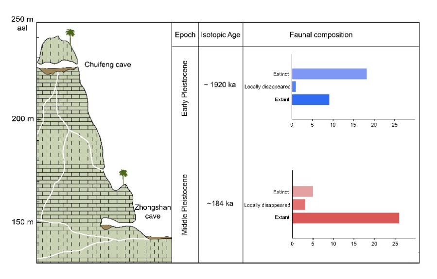 研究团队对中山洞遗址出土的2978颗牙齿化石进行了详细的分类鉴定,共确认了33种大型哺乳动物分类群(共6目),包括华南地区更新世典型的戴氏猩猩、剑齿象、最后鬣狗、巴氏大熊猫和硕豪猪等化石种或亚种,以及大量的现生物种。动物群中种类丰富、数量庞大的偶蹄类和奇蹄类反映了从密闭森林到开放式混合类型的栖息地,代表了动物群对冰期阶段季风增强等气候变化的响应。以中山洞动物群为代表的中更新世晚期动物群,反映了该阶段在整体演化序列中的变化情况(图2)。早到中更新世的动物群变革明显较大,而中更新世到晚更新世的过渡相对平缓。而在与邻近的崇左地区的动物群对比中,不同的演化模式代表了区域间的差异,可能与区域间不同的生态环境情况有关(图3)。