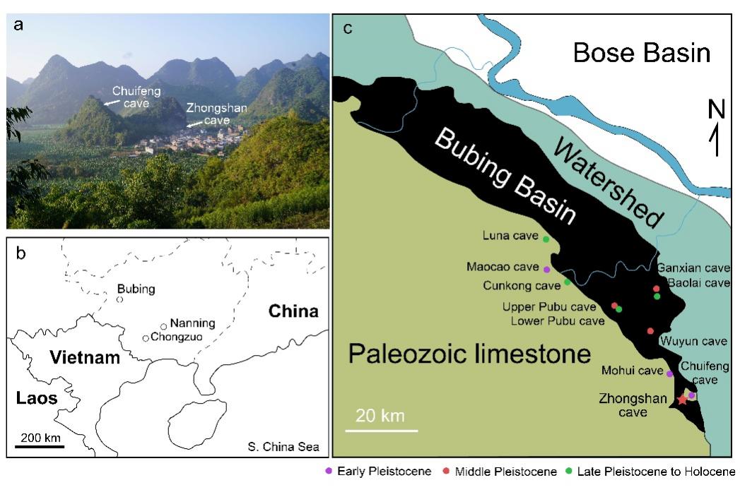 人类演化研究团体通过对广西布兵盆地中山洞遗址(图1)的精确测年、动物群的准确分类鉴定和组成成分分析,补充了中国南方中更新世晚期哺乳动物群序列记录,揭示了距今18万年左右,MIS 6冰期阶段大型哺乳动物群的演化情况,为探讨动物群演化与环境变化的关系提供了重要的参考,同时也为探索东亚及东南亚地区现代人起源和演化提供了重要的古生物学背景。