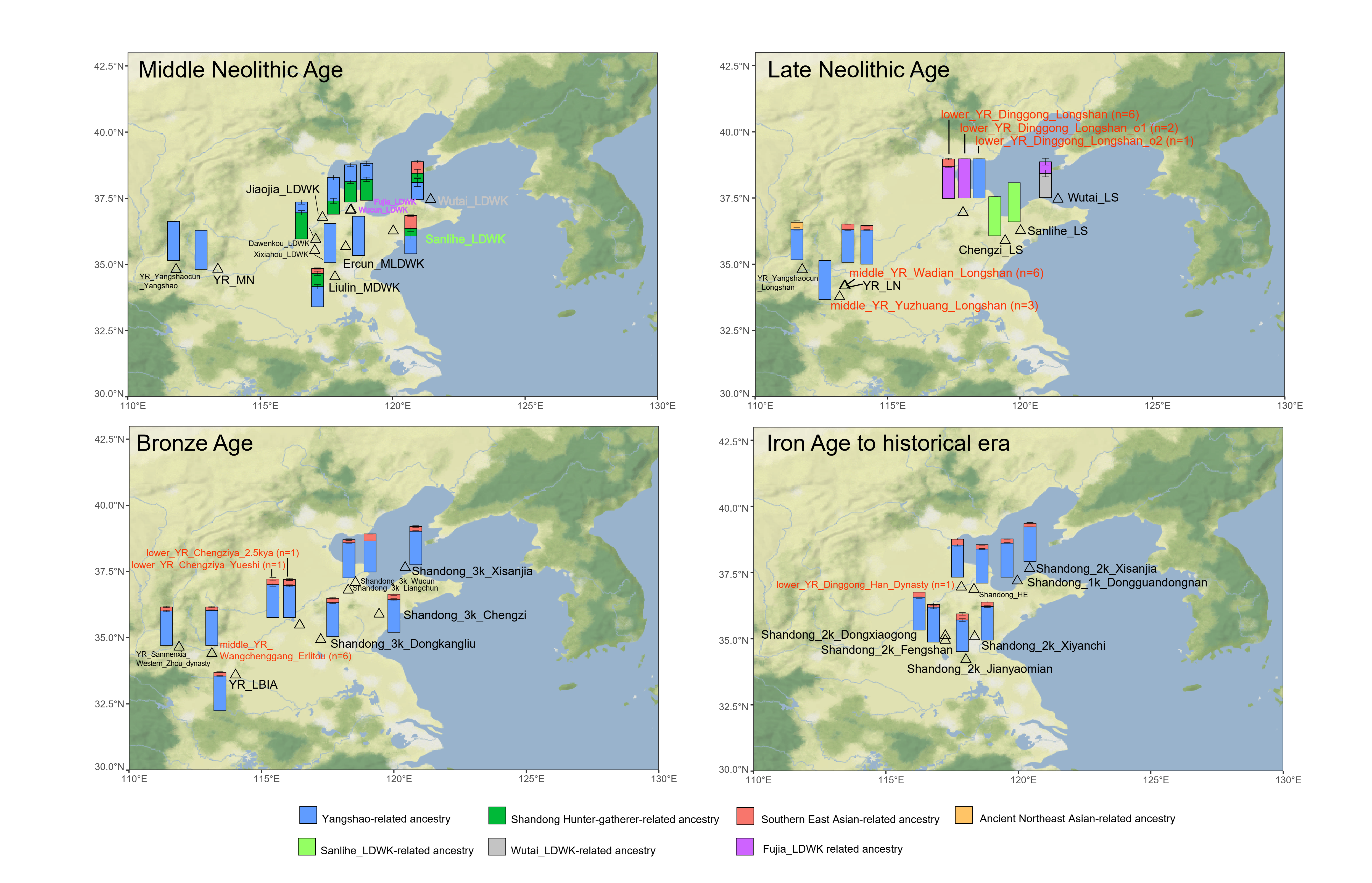 研究团队从海岱地区的丁公和城子崖等遗址搜集和测序了13个古人样本的基因组,从中原河南地区的瓦店、余庄和王城岗等遗址获得18个古人样本的基因组数据,这些样本时间跨度从新石器时代晚期龙山文化时期到铁器时代。研究发现中原和海岱地区史前时期存在复杂的人群互动关系,龙山文化时期两地均呈现出显著的遗传多样性,而青铜时代中原人群对周边地区有着重要的遗传影响。