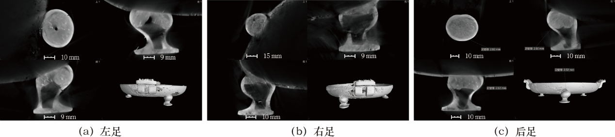 经CT成像分析,三足内保留部分泥芯,未见芯撑的迹象。三足根部挖去泥芯的深浅不一,使得后足充入的金属液最多,右足充入的金属液最少。