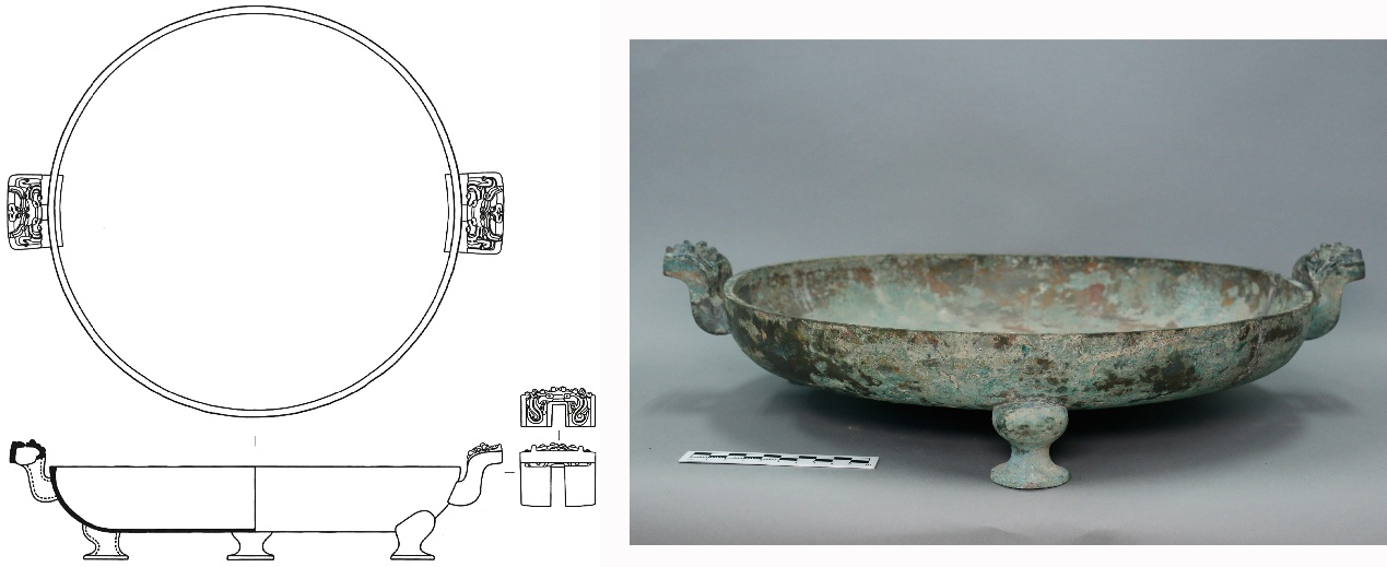 青铜盘为方唇,口微敛,浅腹,弧腹斜收,平底;上腹部设两个外折附耳,器底附三蹄足。青铜盘除附耳顶面为透雕兽面形,器身及器足均为素面。青铜盘个体较大,口径39.2厘米、腹深5.7、通高11.3厘米。