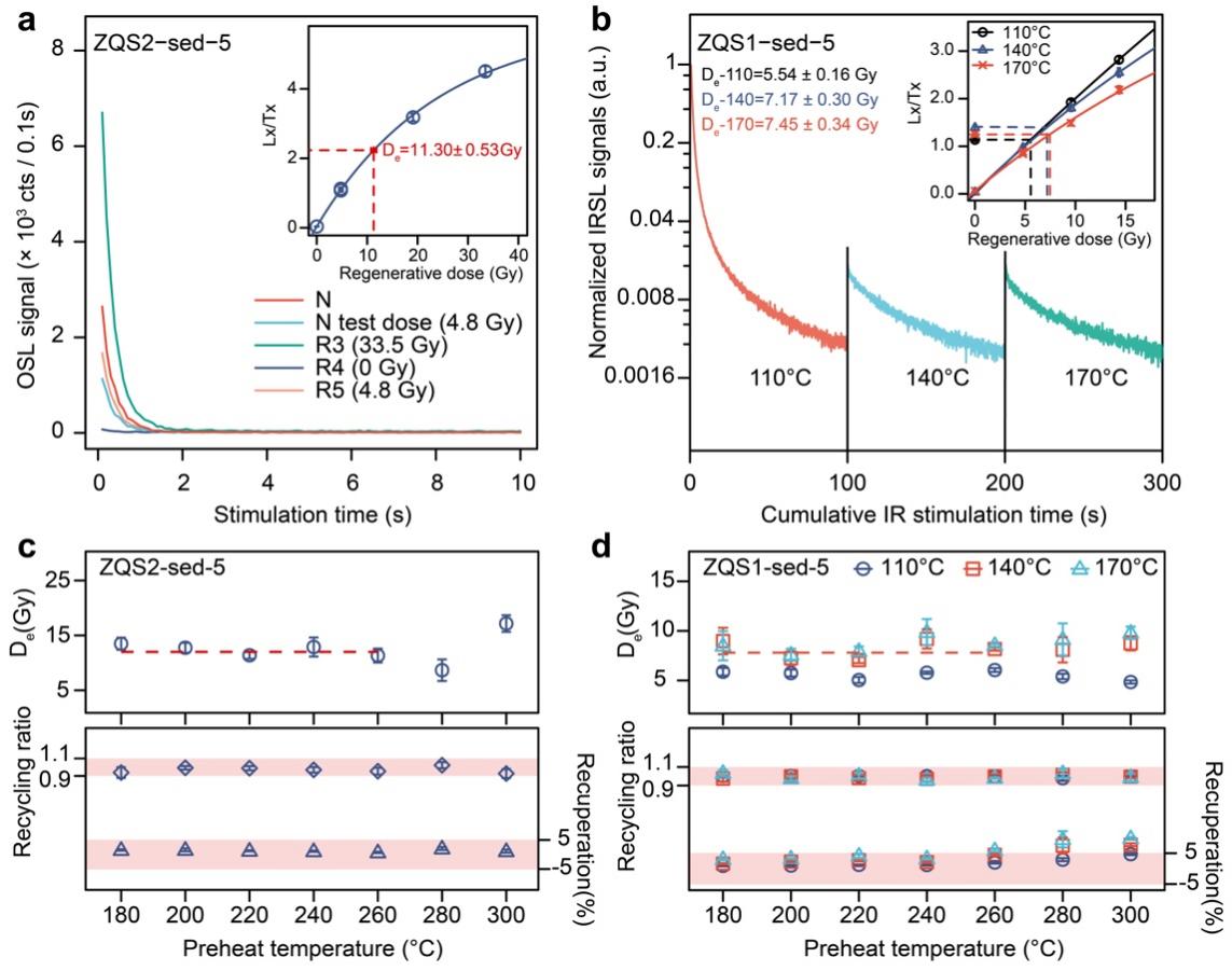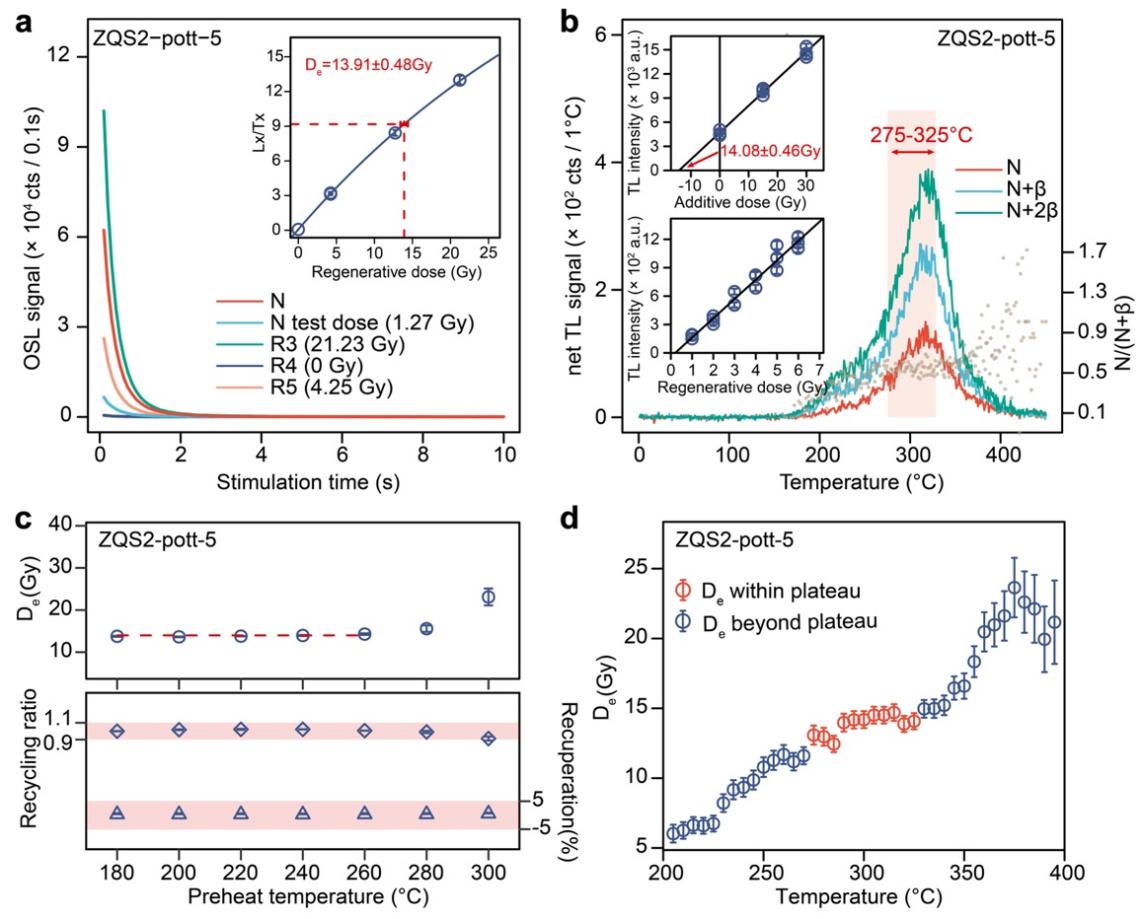 研究团队于考古发掘现场的代表性探方剖面上原位采集了陶器与沉积物释光定年样品(图2),并采用单片再生剂量光释光(OSL-SAR)、多片附加剂量热释光(TL-MAAD)、多步骤升温红外后红外激发释光(MET-pIRIR)等多种技术,全面测定了陶器细颗粒石英及沉积物粗颗粒石英、钾长石的等效剂量(图3,图4),并探讨了陶器与沉积物的释光性质及其对等效剂量准确度的影响。