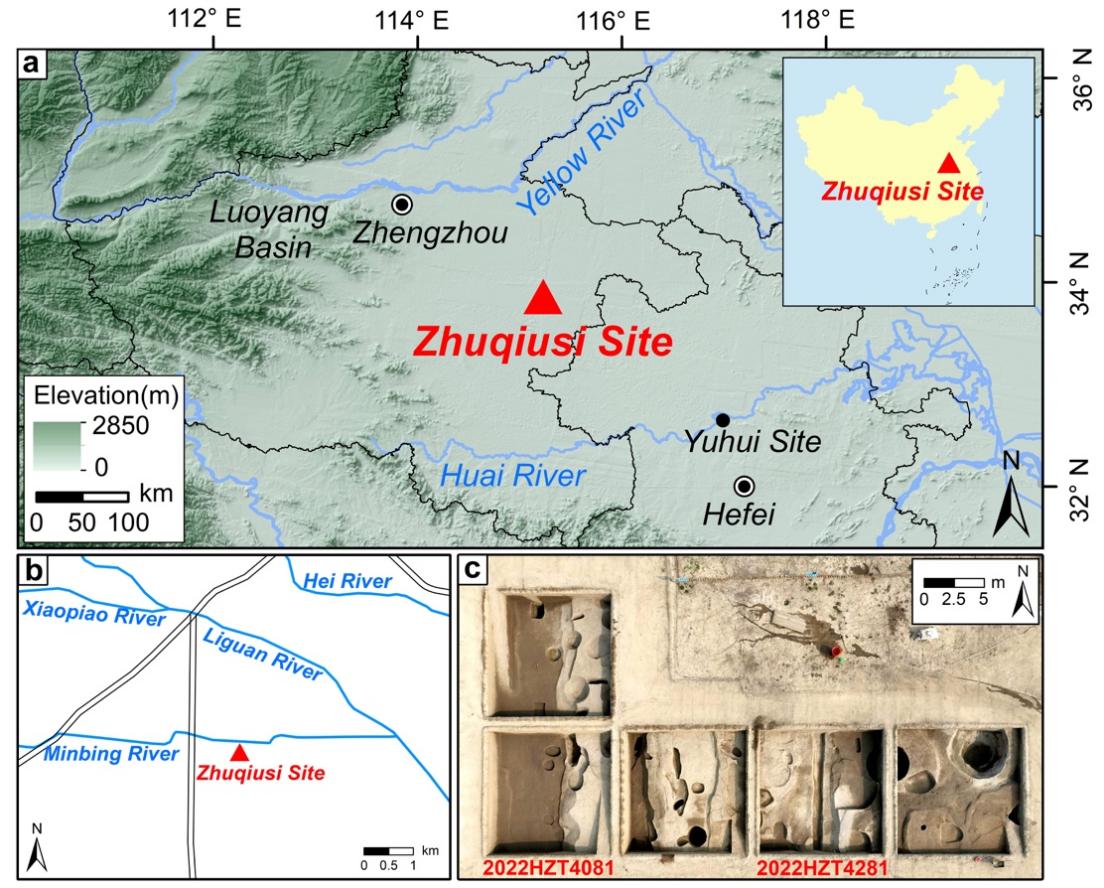 研究以河南淮阳朱丘寺遗址为例,系统开展了陶器和沉积物的多方法释光定年工作。朱丘寺遗址位于河南省周口市淮阳区四通镇王菜园村东南,是一处以龙山晚期造律台文化堆积为主的聚落遗址(图1)。2022至2024年,在“考古中国·夏文化研究”重大项目统领下,河南省文物考古研究院联合周口市文物保护和考古研究中心对遗址进行了主动性发掘,揭露出一批外围夯垫土、房址、粮仓、墓葬等龙山晚期遗存。厘清该遗址的年代框架,对研究洛阳盆地夏文化中心与淮河流域夏文化的关系、探讨龙山晚期的区域社会组织与文明化进程具有重要意义。