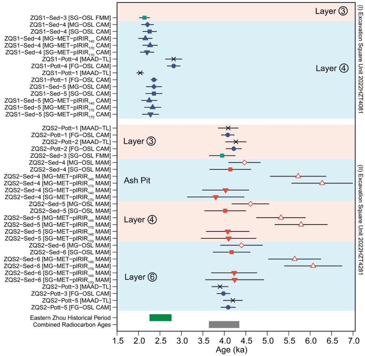 结果表明,陶器石英光释光年代与经过超线性校正的热释光年代具有一致性;而沉积物石英与钾长石则普遍存在晒退不充分和沉积后扰动等问题,需采用单颗粒技术,并配合中值年龄模型(CAM)、最小年龄模型(MAM)或有限混合模型(FMM)才能获得可靠的年代结果。研究基于陶器与沉积物释光定年结果,综合确定朱丘寺遗址的绝对年代框架可划分为东周时期(2.14–2.82 ka)和龙山晚期(3.90–4.27 ka)两个阶段(图6)。