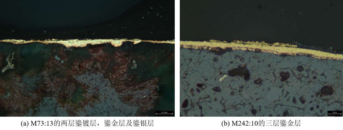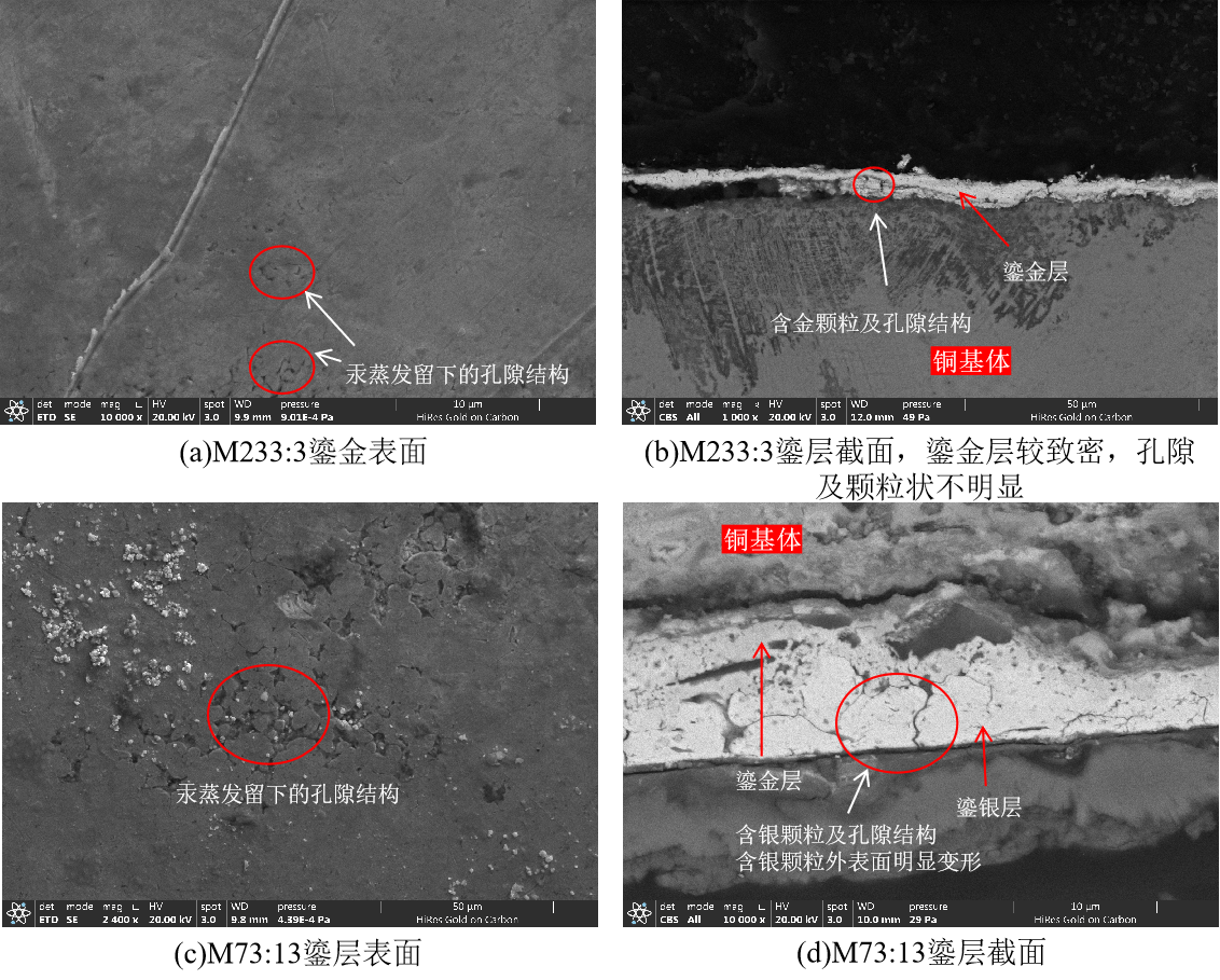 研究结果表明,这批铜棺饰除1件为锻造成型外,其余均为铸造成型。基体材料多为含锡量低于7%的低锡青铜,且几乎不含铅,说明汉代工匠在制作鎏金银铜器时已有意识选择更适合进行表面装饰的合金材质。通过对鎏镀层的成分与结构分析,明确了汞的存在,证实其采用了传统的“金汞齐”“银汞齐”鎏金、银工艺。