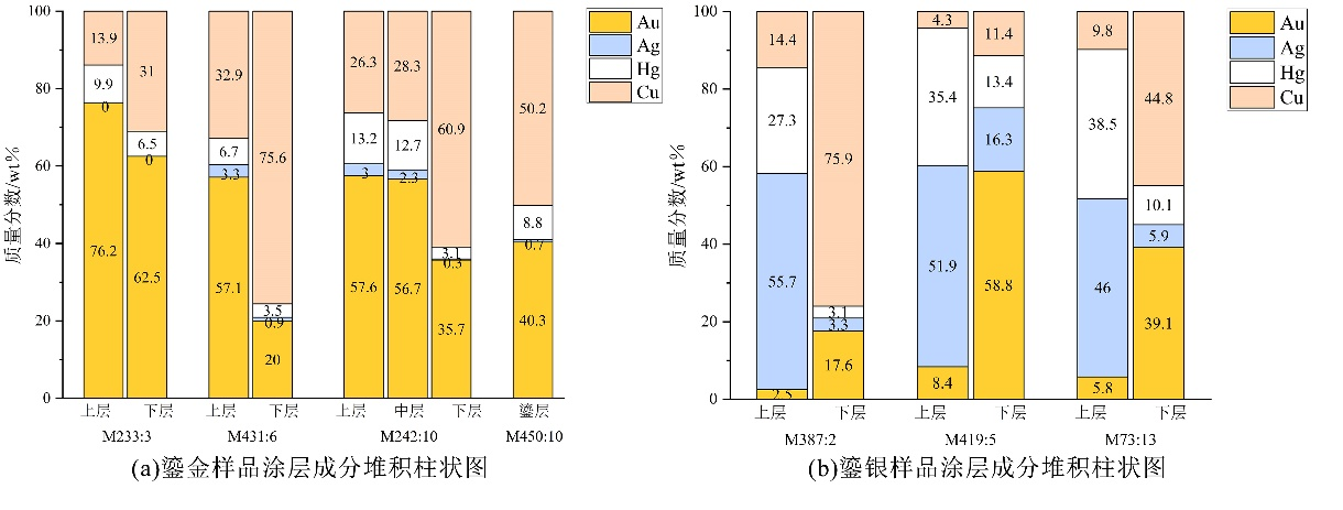 图二 鎏金银样品涂层成分堆积柱状图