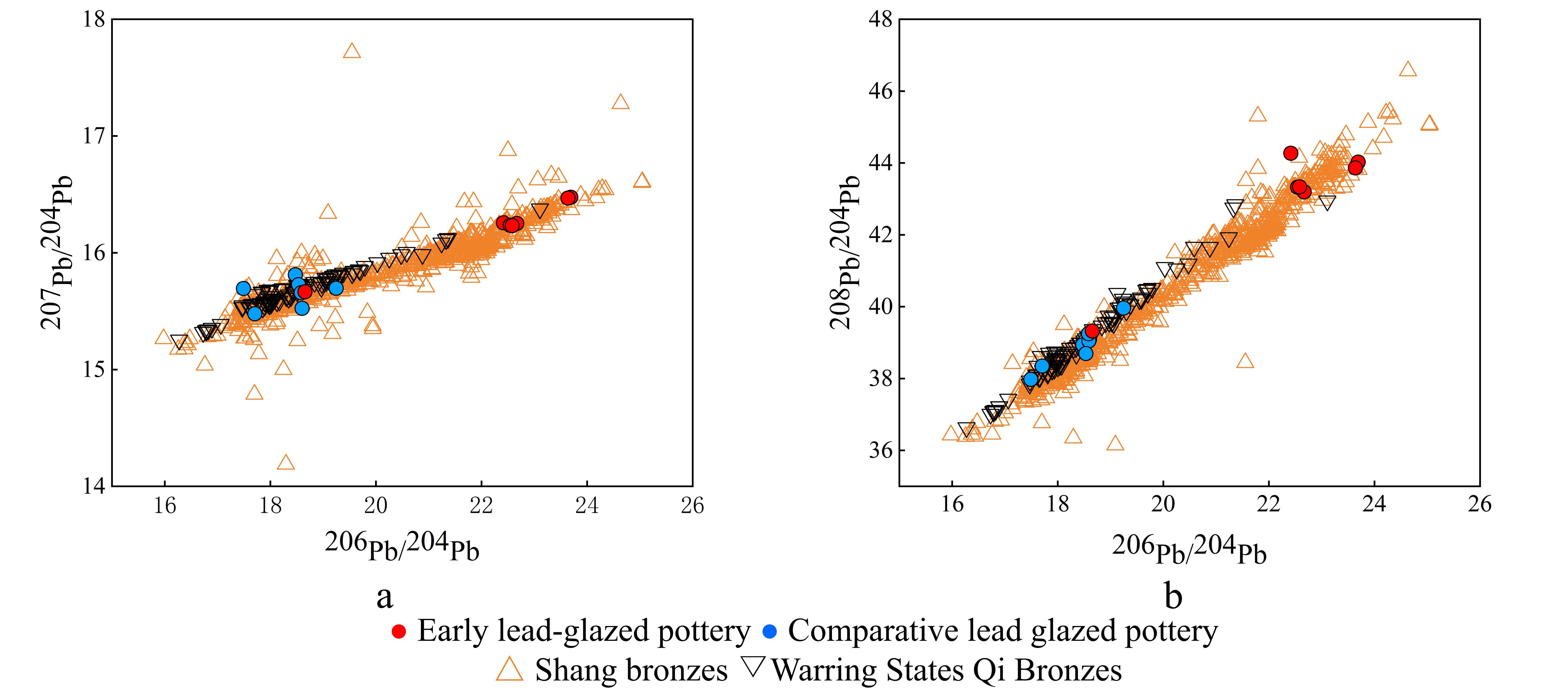 战国铅釉陶的铅同位素比值(⟡⁰⁶Pb/⟡⁰⁴Pb >22,⟡⁰⁸Pb/⟡⁰⁴Pb >43)呈现高放射性铅特征,与汉代山东地区铅釉陶差异显著。该铅源与同时期临淄青铜器高度匹配,指向同一特殊矿源,证明了战国时期临淄地区不同手工业之间的跨领域工艺互动。