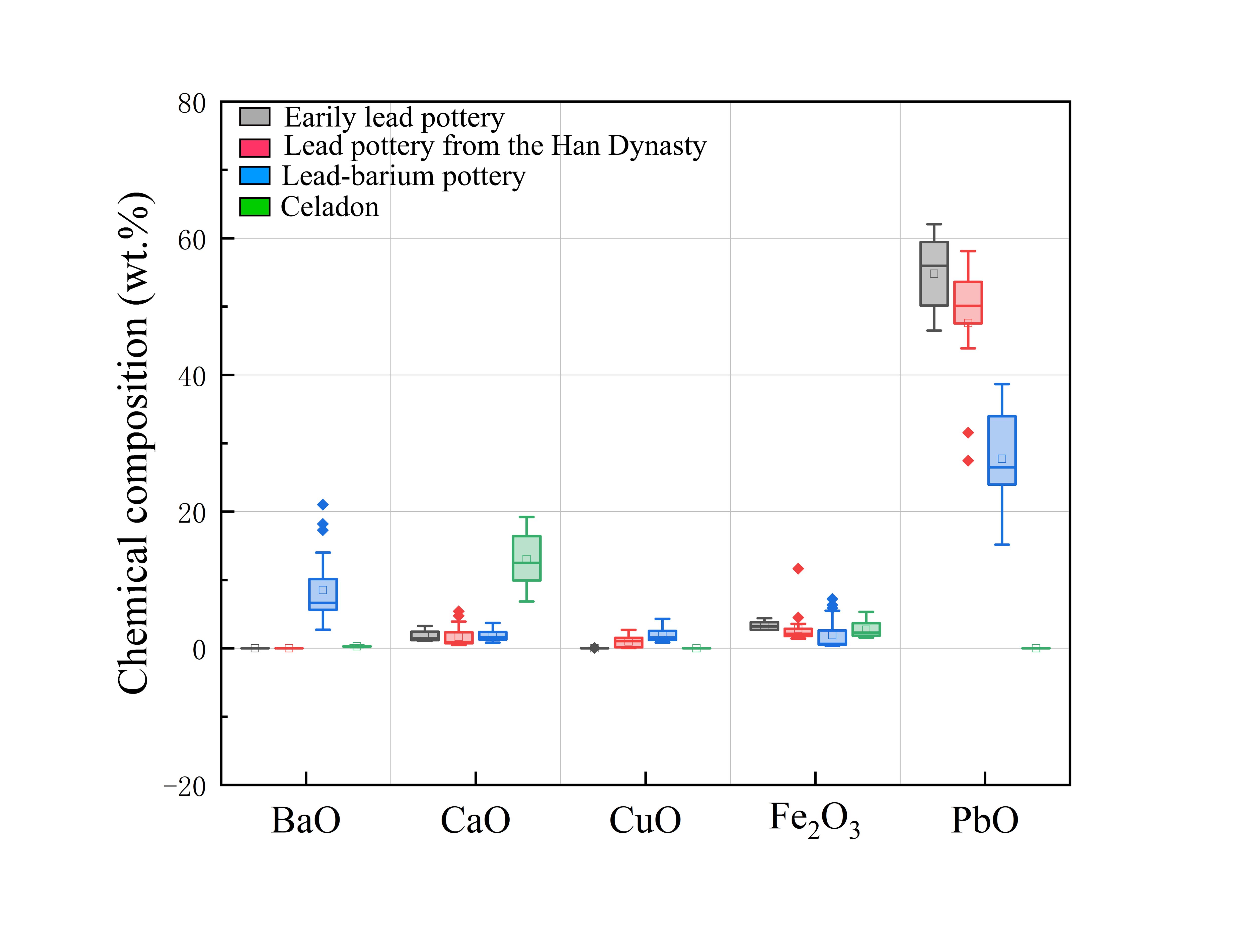 图三 铅釉陶、铅钡硅酸盐制品与原始瓷的主要助熔剂与着色剂对比