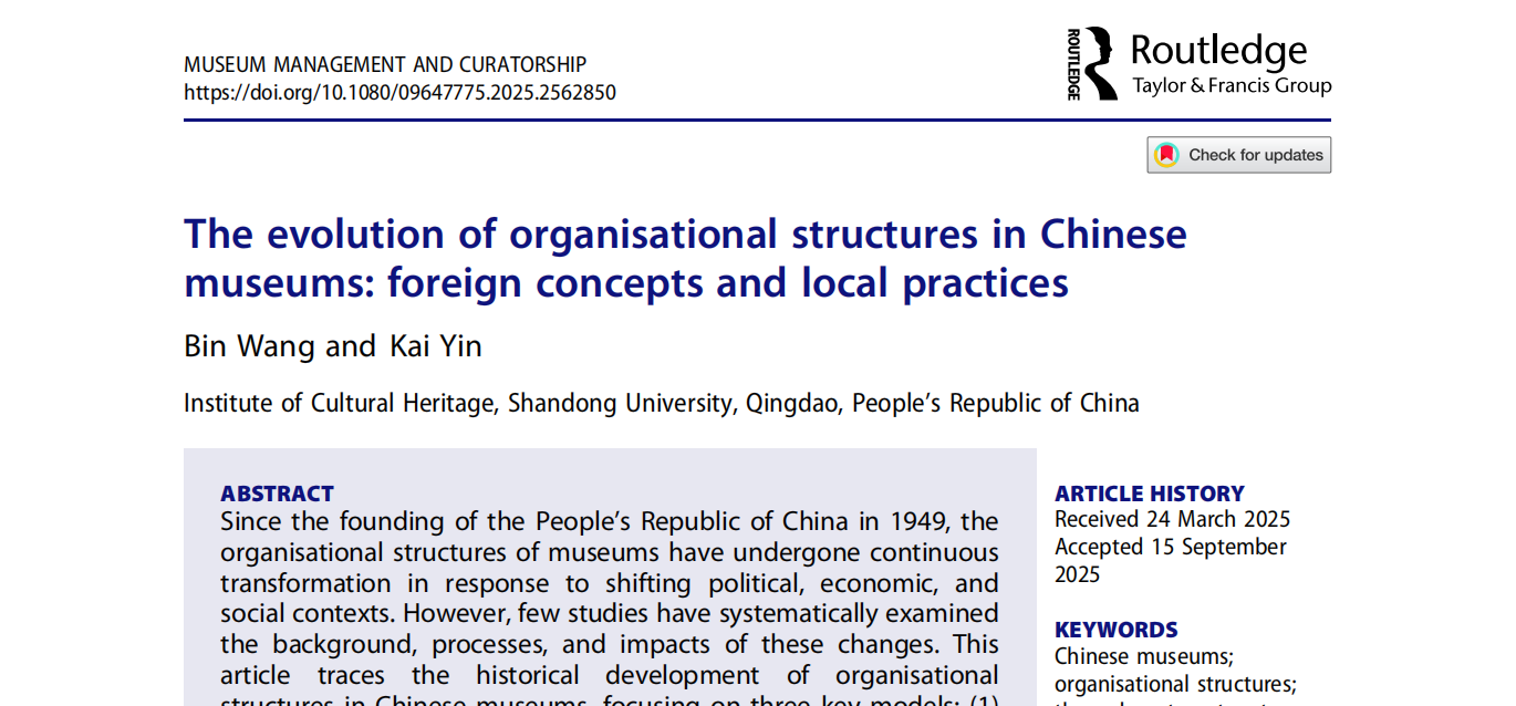 文化遗产研究院在国际期刊Museum Management and Curatorship上在线发表了题为“TheEvolution ofOrganisationalStructures inChineseMuseums:ForeignConcepts andLocalPractices”的学术文章。文章第一作者为文化遗产研究院博士研究生汪彬,通讯作者为尹凯教授。