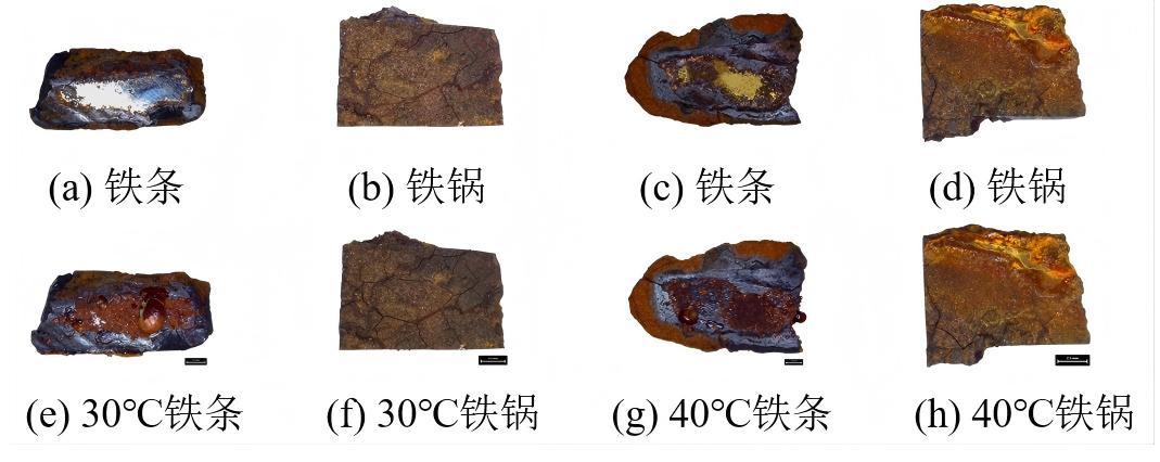 研究表明,铁条和铁锅在相同温度条件下随着相对湿度的升高,其腐蚀增重速率不断变大。当相对湿度超过60%时,铁质文物的腐蚀产物覆盖面积增大;当相对湿度达到90%时,腐蚀劣化尤为明显(图1)。而在相同湿度条件下,温度的升高会加速腐蚀产物的形成并促进锈层物相的转化,导致锈层开裂,进而加速铁质文物的劣化。