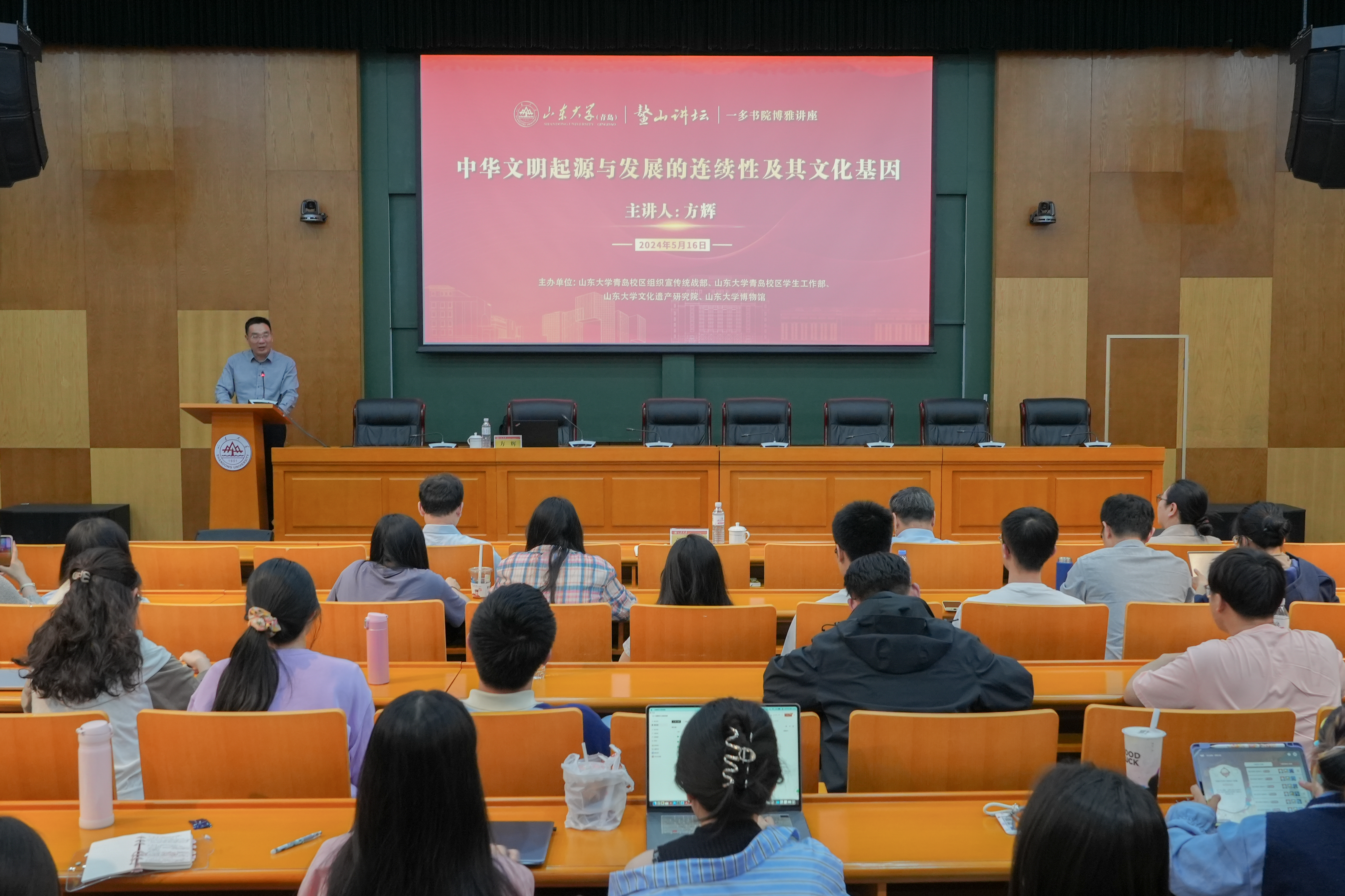 文化遗产研究院院长方辉教授受邀做客第40期“鳌山讲坛”暨一多书院博雅讲座,作题为“中华文明起源与发展的连续性及其文化基因”的专题讲座。青岛校区党工委副书记张海波主持讲座。