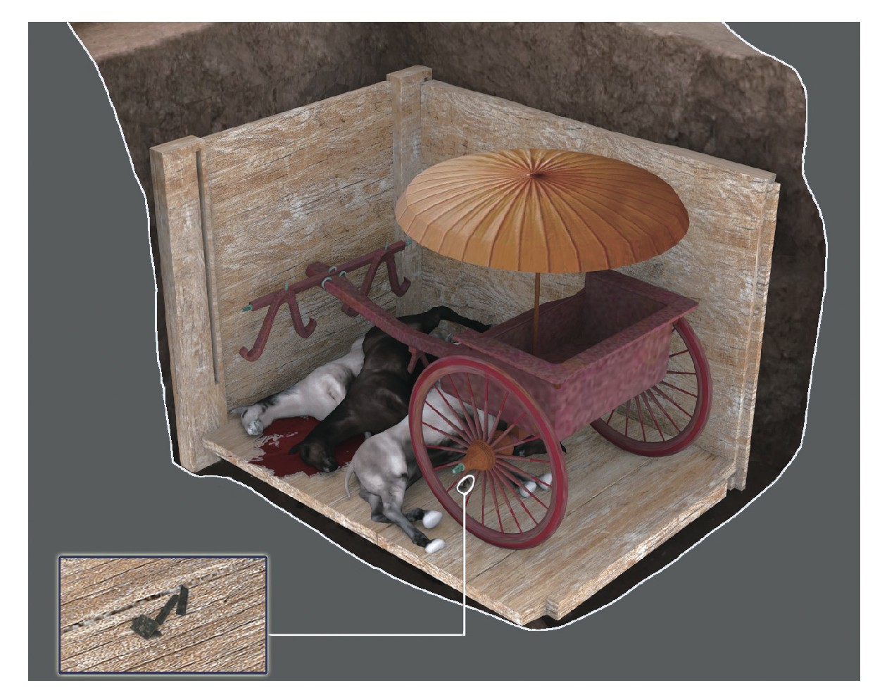 A型为较大较深的长方形坑,内有木车及马匹,一般为四马一车。坑底出土玉器组合(玉人2件、玉琮玉璜各1件)。