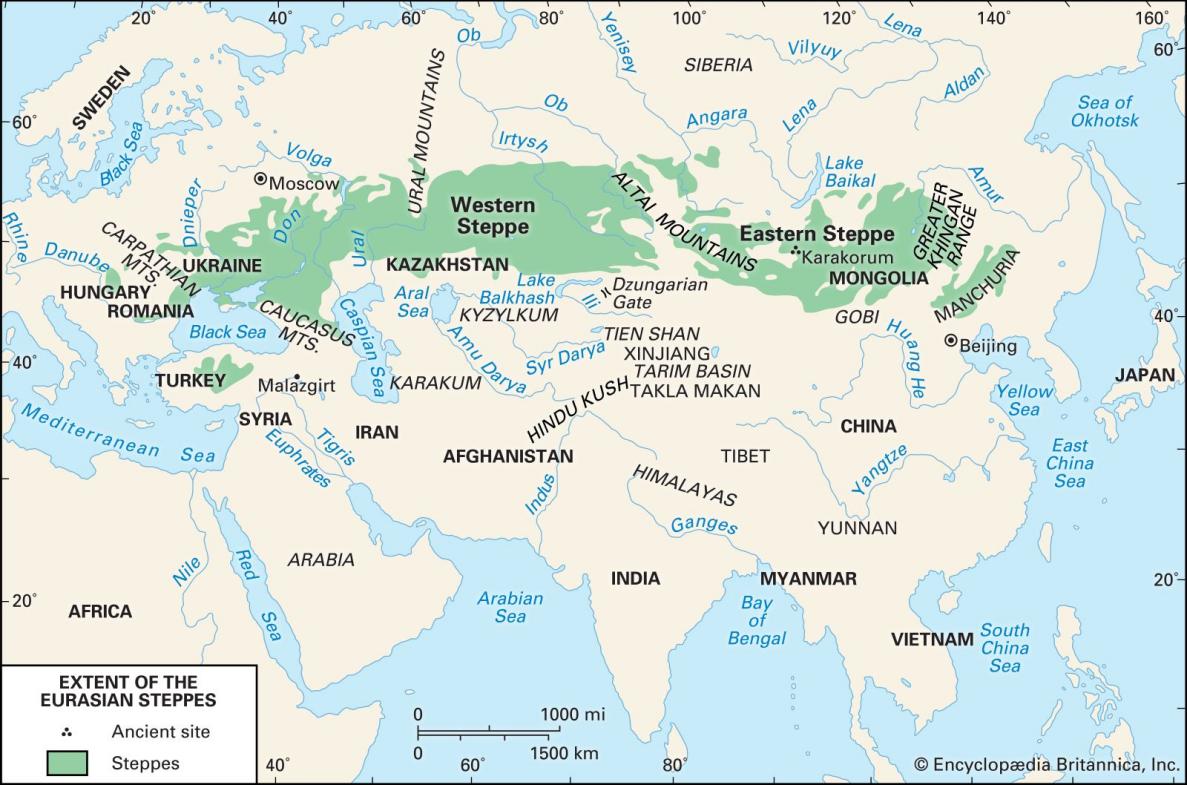 欧亚草原西起欧洲—东欧草原,横跨欧亚大陆,东抵我国的松嫩平原。东西长8000多千米,南北宽600~800千米。以阿尔泰山为界,西侧为潘诺尼亚草原、东欧大草原和哈萨克大草原,东侧为蒙古高原和松嫩平原。在欧亚草原新石器时代渔猎采集人群和欧洲东部新石器时代的农牧业的人群交流互动下,最终产生了颜那亚文化(3300~2600BC)。其延续了此前饲养牛、羊和猪的传统,而马作为一种新的家畜在这一时期出现了,甚至发现了季节性营地,这很可能是畜牧到游牧转变的开始。颜那亚文化向东传播,跨越欧亚草原,抵达米努辛斯克盆地,形成了阿凡纳谢沃文化(3200~2500BC)。