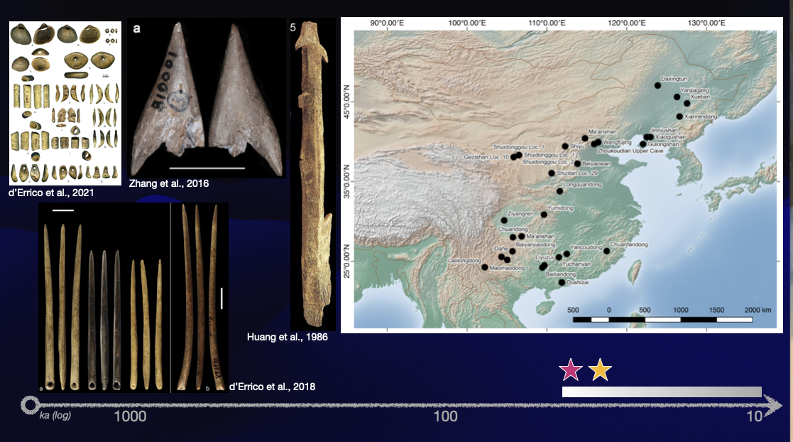 鲁可还介绍了其团队关于中国现代智人的群体互动与文化技术的研究。一是他们建立了华北地区更新世出土骨装饰品的数据库,发现华北西部与东部的骨装饰品存在明显差异:西部为鸵鸟蛋壳制品,其上装饰羽毛;东部则更为多样化,包括动物犬齿、贝壳饰品、穿孔卵石、鸟类骨骼等。但从距今2.5万年前开始,东部的骨装饰品逐渐消失。东西部的差异在一定程度上反映出人群的差异,东部骨装饰品的消失可能暗示着人群的迁移或融合。