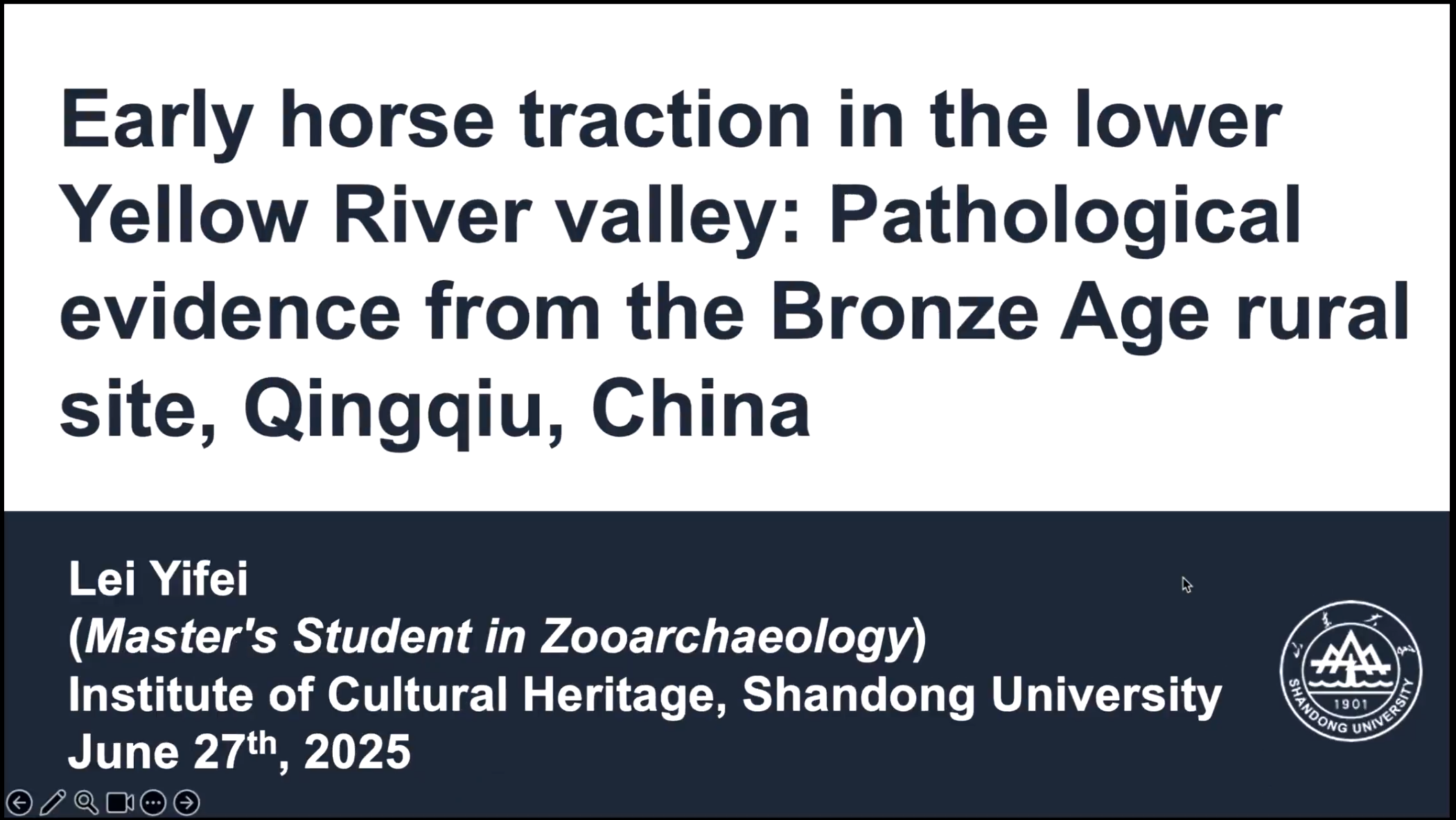 硕士研究生雷仪菲作了题为《黄河下游地区的早期马匹牵引:来自中国青铜时代乡村聚落青邱的病理证据》的汇报。她汇报了青邱遗址出土晚商时期6匹马骨的病理研究结果。结果显示,在黄河下游地区的乡村聚落,平民在晚商时期便已开始役用家马进行牵引工作,但与同时期的王畿或区域中心聚落贵族使用成对家马拉车的策略不同的是,青邱平民仅使用单匹马进行牵引,这体现了晚商时期不同社会阶层对马匹的利用方式存在差异,平民相较于贵族而言更重视马匹作为役畜的基础功能。最后,雷仪菲结合晚商的社会背景,指出家马在当地资源运输中起到了重要作用,促进了商王朝统治网络的有效运行。