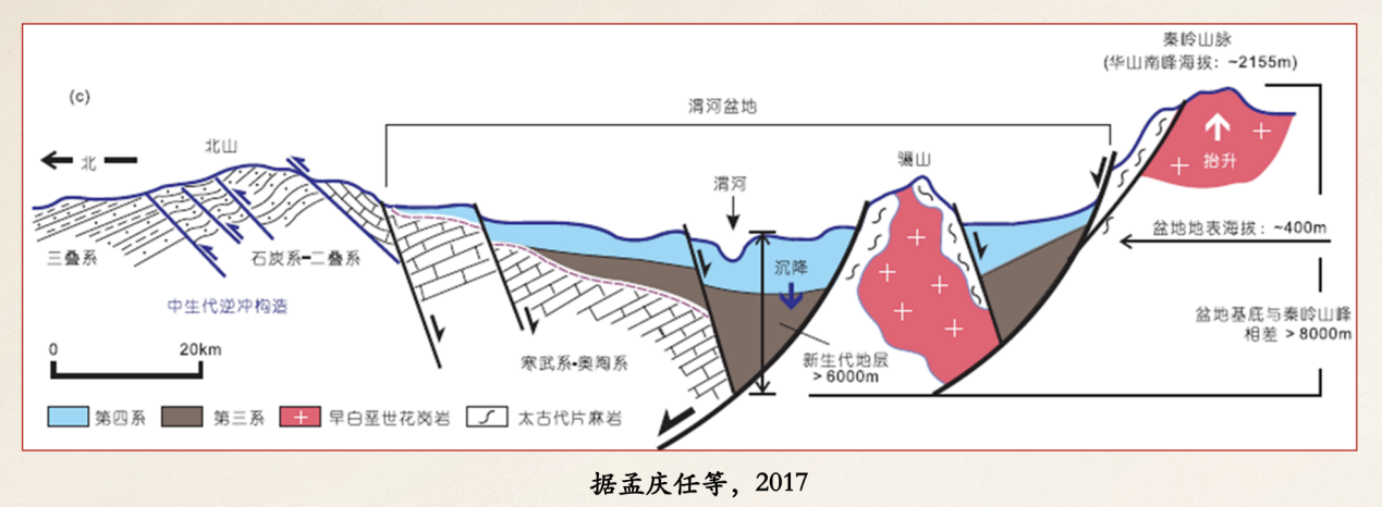 渭河盆地是中国重要的新生代盆地之一。渭河盆地受南北挤压影响,4500万年前开始形成,与秦岭形成过程一致,500多万年前基本定型。具体而言为扬子板块与华北板块挤压,形成隆升(秦岭)与断陷(汾渭地堑)。通过钻层岩心研究,渭河盆地新生代沉积厚度超过6000米,呈现南边厚、向北逐渐变薄的趋势,这与骊山、华山等秦岭相关山体有很大关系。更新世阶段,渭河盆地曾发育有三门湖,随着流水汇集,湖水不断增多,最终向东切开通道,与三门峡贯通,促成了黄河的形成。