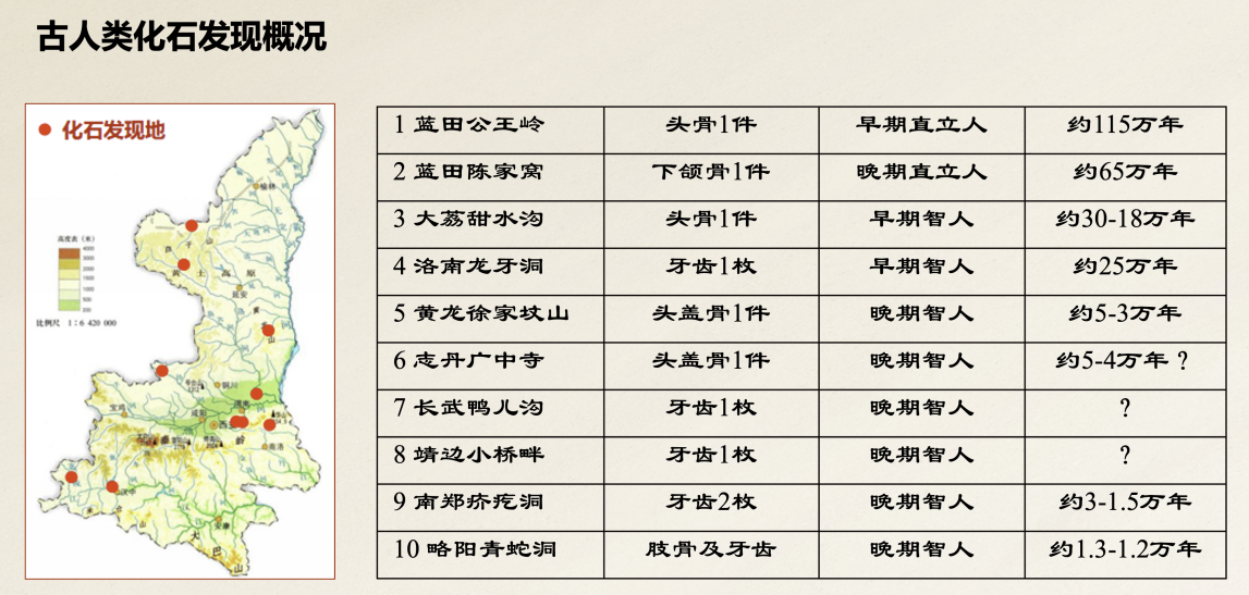 介绍完陕西地区地貌环境演化的背景后,张老师进一步详细介绍了陕西地区古人类化石的相关发现。陕西目前已发现十处古人类化石点,是我国古人类化石发现较丰富的地区之一,不同时代、不同演化阶段的人类化石均有出土。