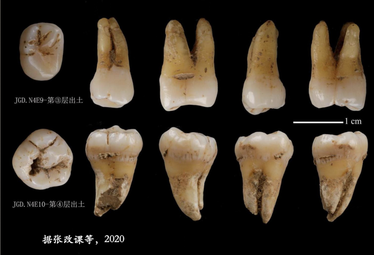 图五 南郑疥疙洞发掘出土的2件晚期智人(现代人)牙化石(第三臼齿)