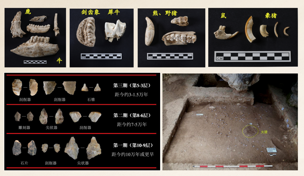 图十 南郑疥疙洞第一至第三期出土石器、动物化石、遗迹情况
