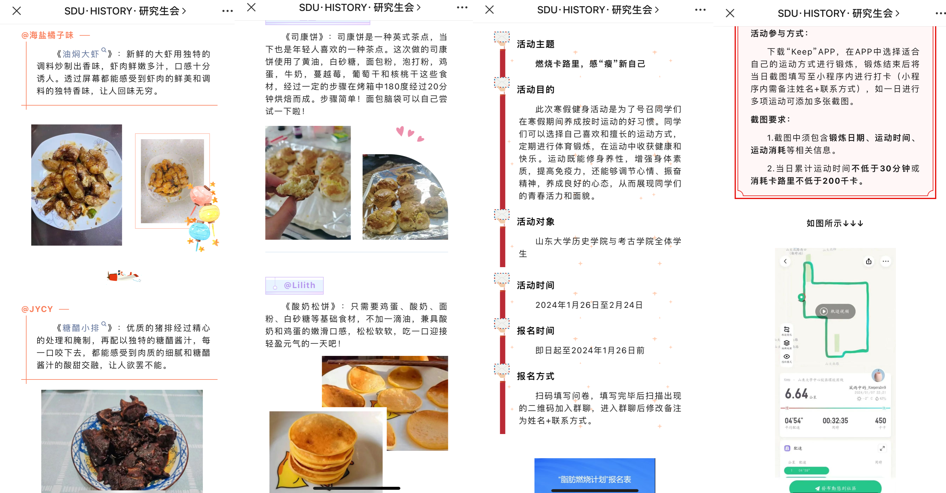 寒假期间,学院推出运动打卡活动“脂肪燃烧计划”,发布寒假运动“秘籍”,与“脂肪燃烧计划”形成一套组合拳,通过生动科普与科学引导,鼓励同学们在寒假期间养成按时运动的良好习惯,共同培养积极向上的健康身心。研究生会组织开展“厨艺大比拼”系列劳动教育实践活动,设置“年夜饭——我最拿手的一道菜”、“甜甜甜,我的甜甜最甜(甜点)”以及“开学在即,献上我的家乡菜”三个主题,培养学生崇尚劳动、尊重劳动,在实践中树立正确劳动观,养成健康心态。