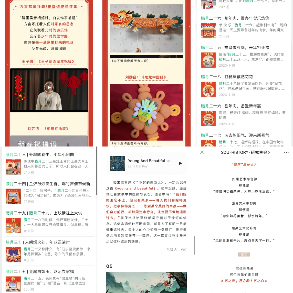 学院学生会开展“历”添新岁,龙游嘉辰年俗作品征集评选活动,在乡音乡情中体验文化传承,以图文声情等多种方式展现了各地区各民族的文化特色,感受中华传统文化的独特魅力。研究生会公众号持续推出“新年俗海报”,通过创新演绎年俗,弘扬优秀传统文化,表达深切的新年祝愿。寒假期间,研究生会于公众号平台推出新栏目“撷艺”,用以推送艺术类演出与展览的相关资讯,进行主题歌单、书法绘画等艺术作品的推荐等,通过生动活泼的形式进行艺术赏析与交流。