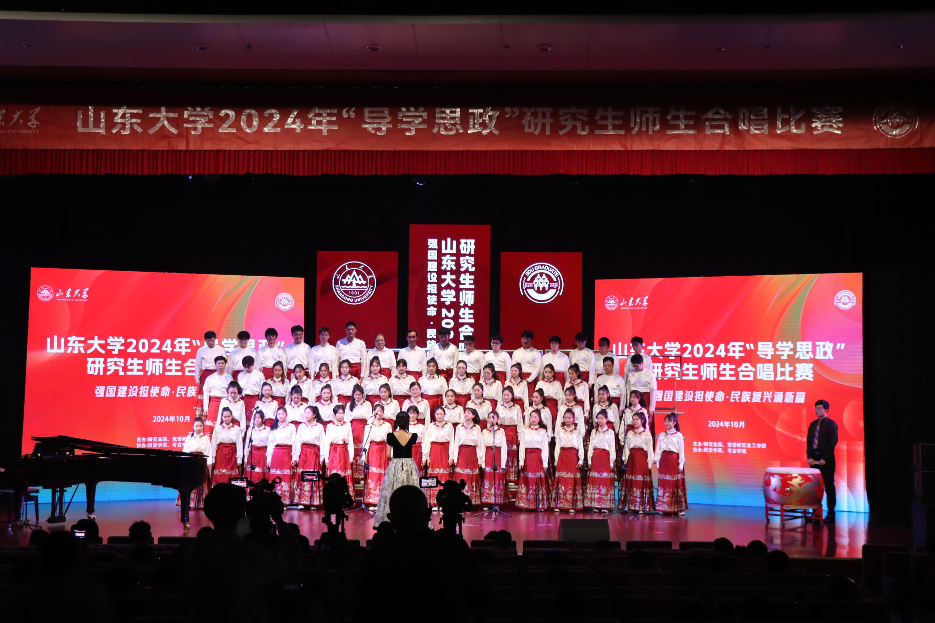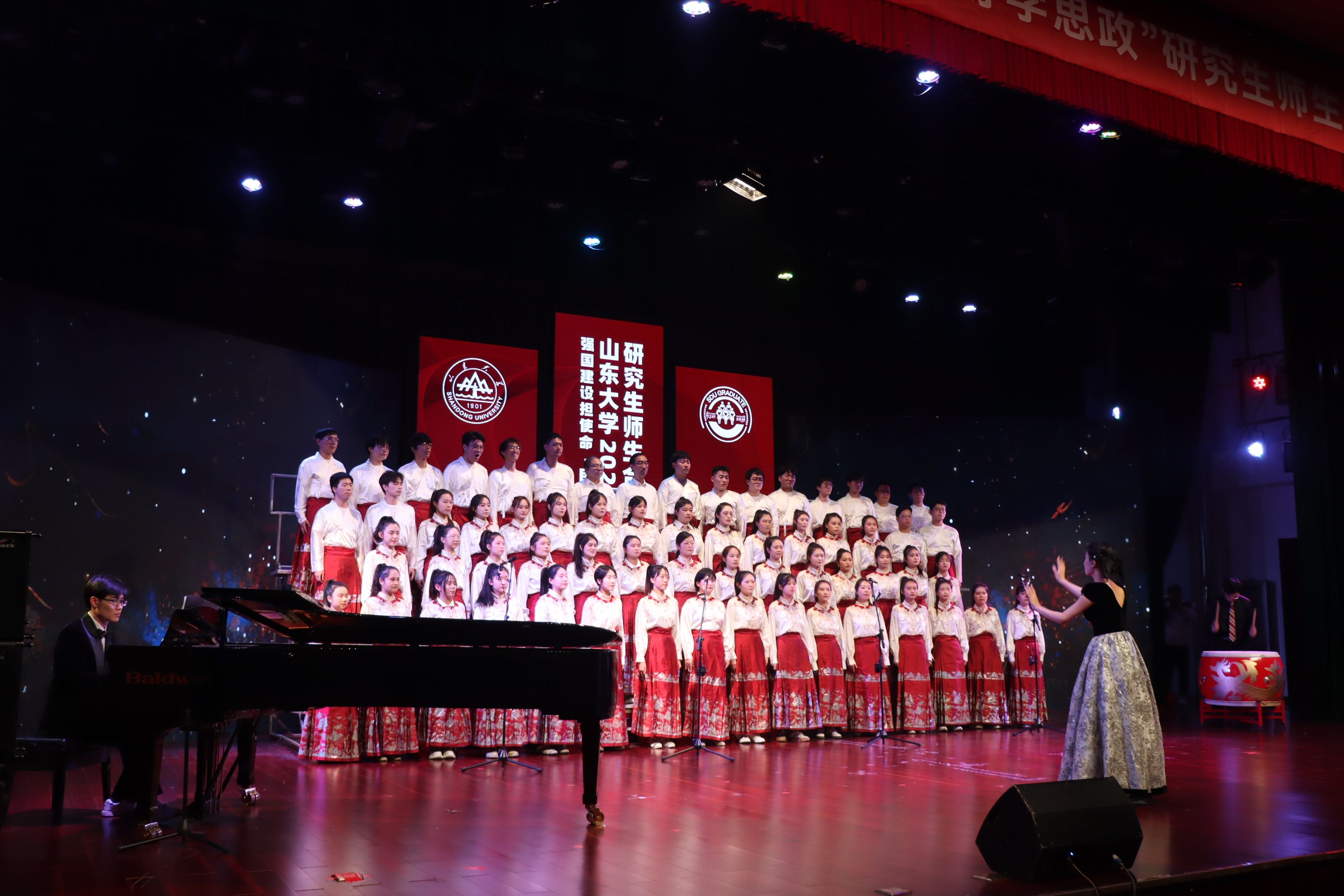 师生合唱团身着汉服,以整齐的队列和饱满的精神状态站在舞台上,在陈奎廷的钢琴伴奏声和赵彤彤的稳定指挥下,师生们共同投入到歌曲的演绎中,将《西风》中的意境和情感表达得淋漓尽致。女声清脆如珠玉,男声浑厚似松涛,师生们的歌声交织在一起,形成了一幅悠扬动人的音乐画卷。王浩臣的鼓声激情澎湃,将演出气氛推向高潮。一曲唱罢,合唱团成员以精湛的演唱技巧和丰富的表演形式赢得了在场评委和观众的阵阵掌声。