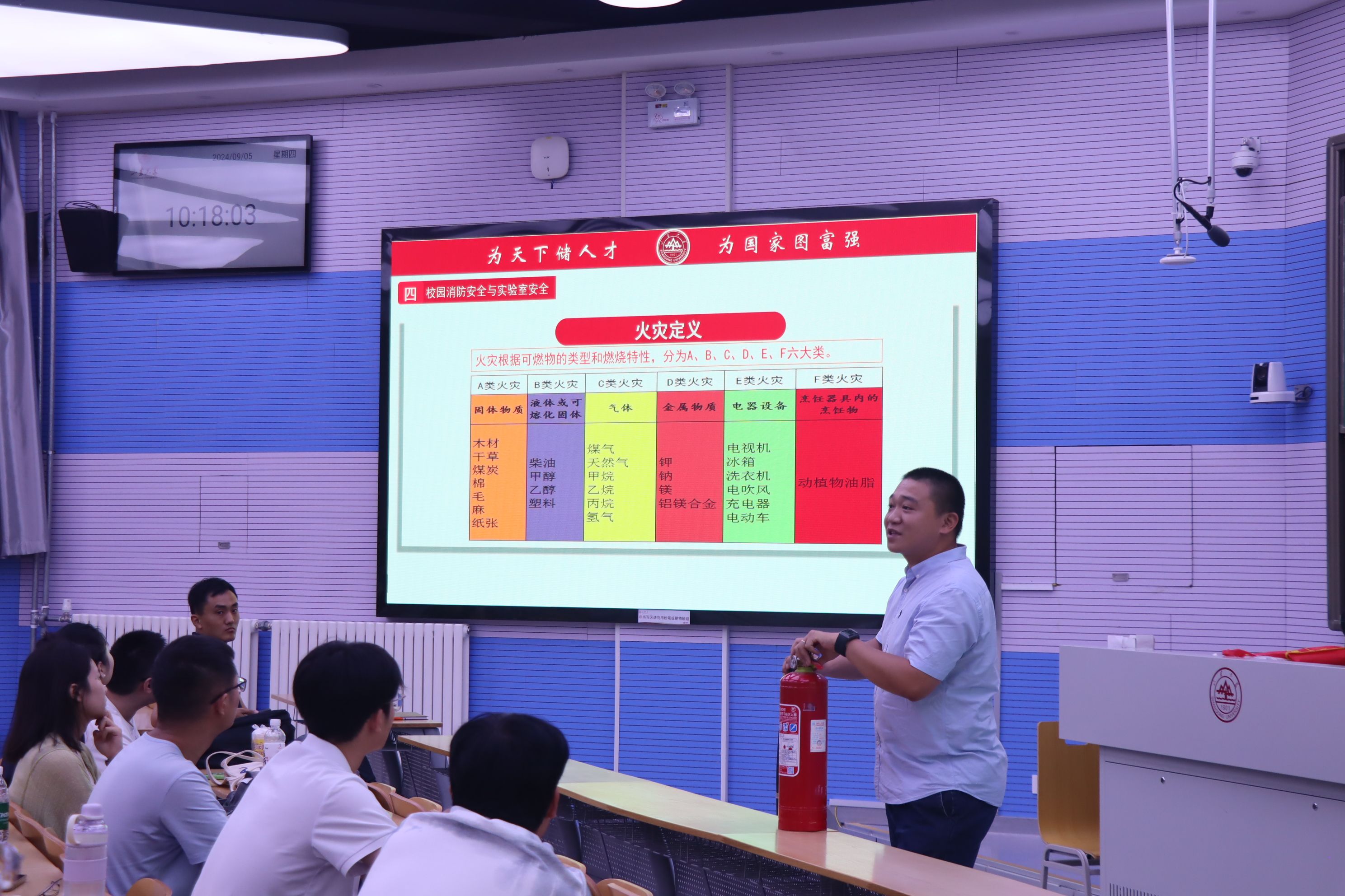 9月5日上午10点至11点30分,2024级研究生新生安全教育讲座在中心校区董明珠楼110d举行,由党委保卫部韩知乐老师主讲。韩知乐通过一系列丰富的案例介绍了学校存在的常见安全隐患,强调了增强安全意识的重要性,特别指出要牢记维护国家安全的注意事项,避免损害国家利益的行为出现;随后韩知乐详细讲解了校园消防安全和实验室安全措施,通过现场操作示范生动地讲解了灭火器的正确使用和火场逃生技巧。最后,韩知乐建议同学们要随时防范电信网络诈骗,注意校园交通安全和自身心理健康,为新生们的校园生活提供了宝贵的安全指导。通过这次讲座,新生们对校园安全有了更深刻地认识,为今后的研究生学习和生活的顺利进行打下了坚实的基础。
