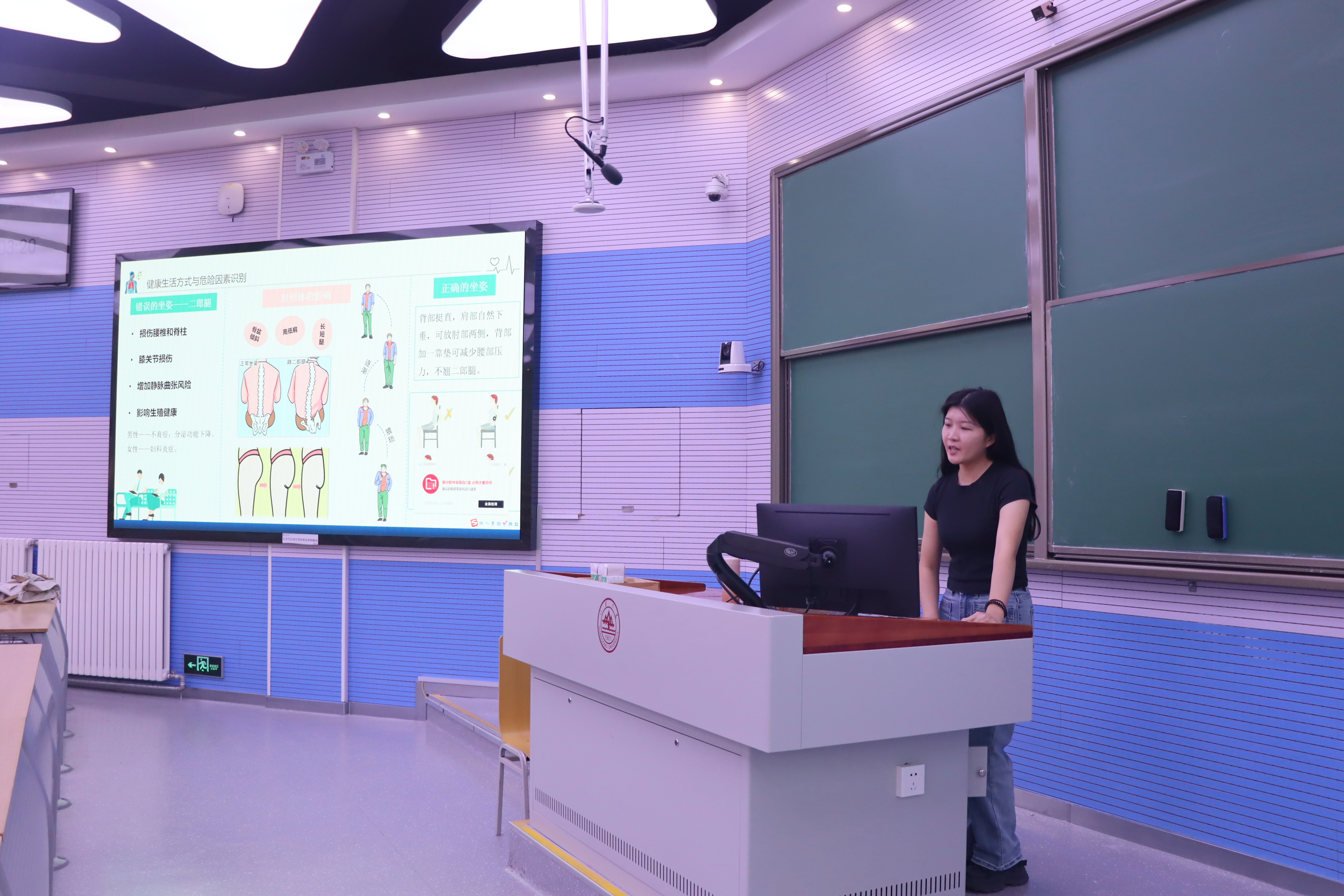 李珊老师主讲。李珊从“健康生活方式与危险因素识别、营养膳食与常见健康指标解读、校园传染病防控知识与技能、意外伤害与卫生应急技能、校园就医指南与医保政策解读”等方面展开讲解。首先李珊采用图文结合的方式向同学们介绍了健康生活方式,指出膳食是人体生长发育和健康最直接和至关重要的因素,长期规律的合理膳食可以提高机体免疫能力、抵御各种疾病;随后李珊向同学们普及了水痘等呼吸道传染病防控处置技能,以及意外伤害的应急措施;最后李珊讲解了校医院就医指南的具体用法,以便同学们可以方便快捷地享受校医院的医疗服务。