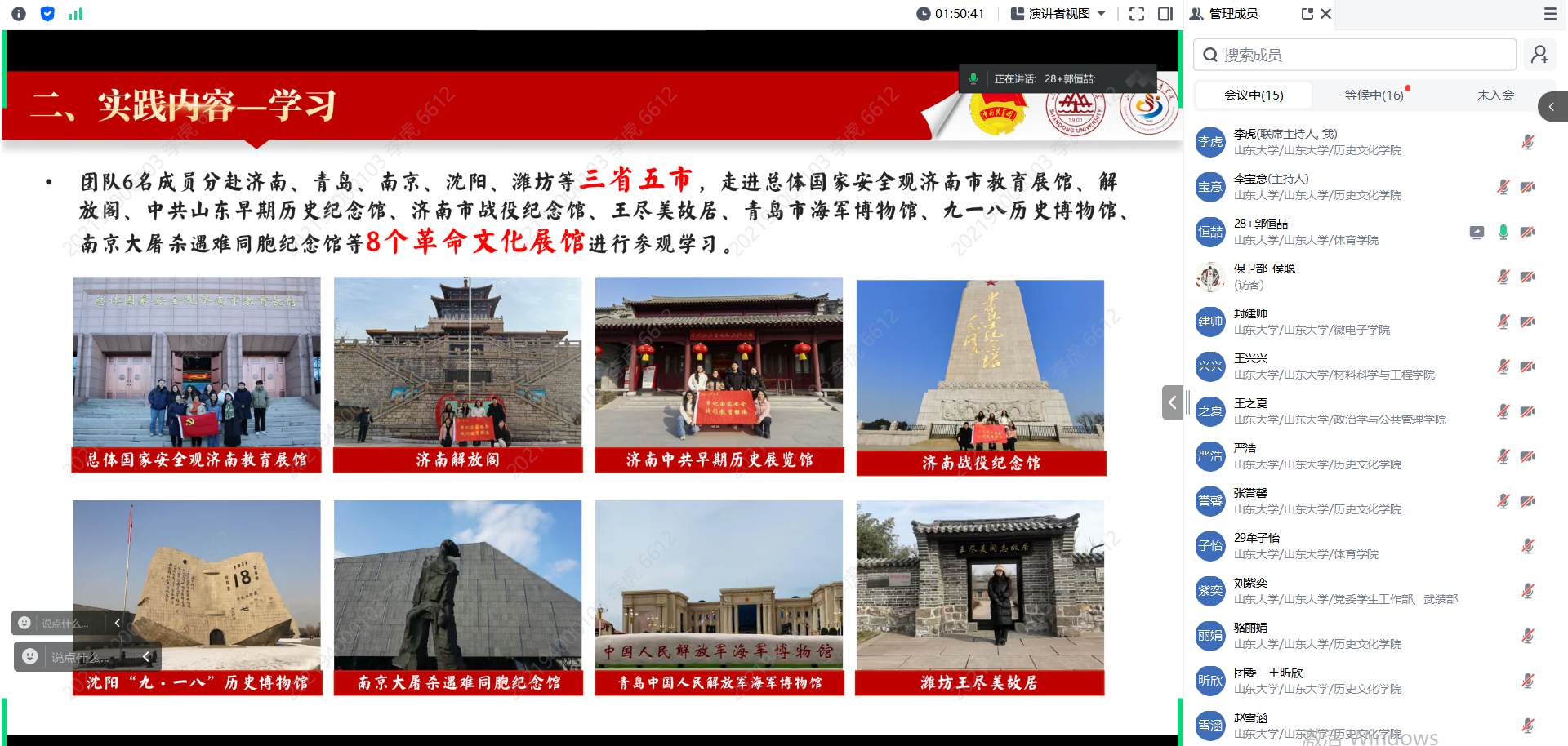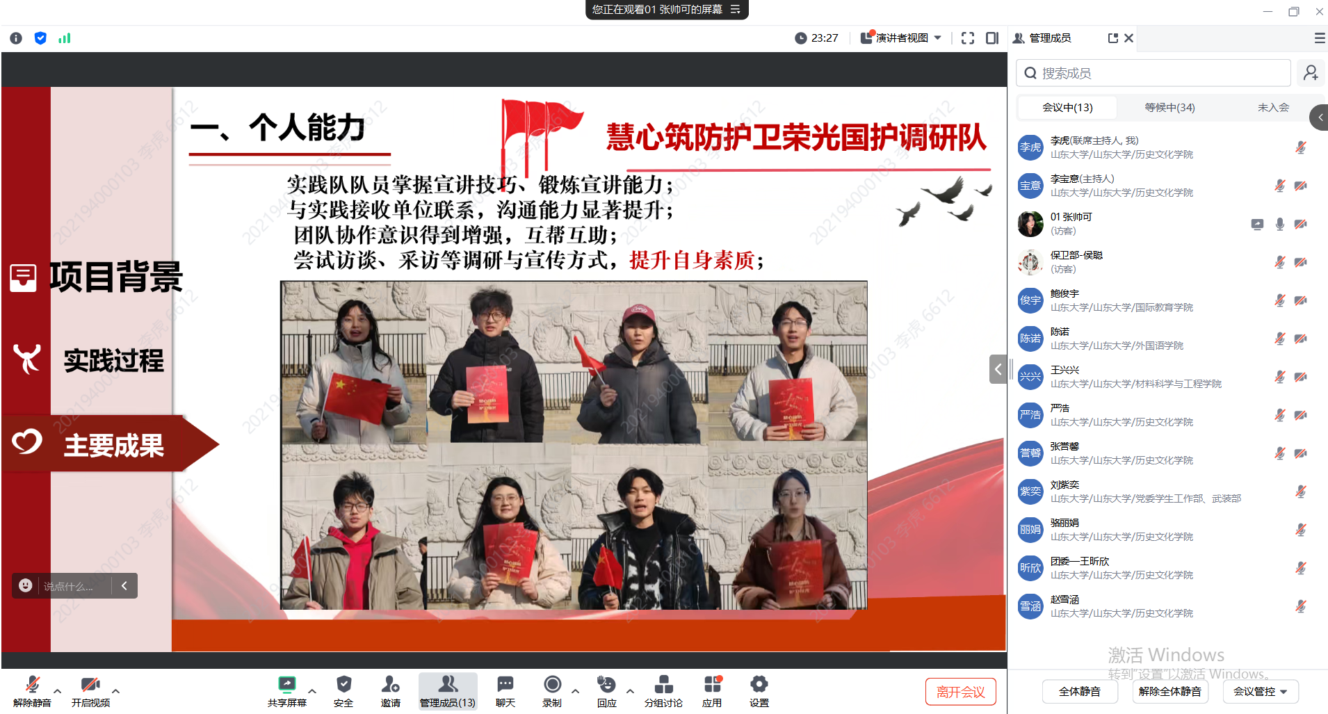 活动中,来自一校三地不同学院、专业的负责同学通过线上平台依次展示了实践过程、实践成果、实践展望等内容。他们完成问卷调查、开展访谈和走访调研,查阅海量资料、深入各地多个育人场馆、组织多形式宣讲,聚焦国家安全专题,深刻阐述国家安全的重要性,深入挖掘开展国家安全教育对当代大学生成长发展的重要意义。